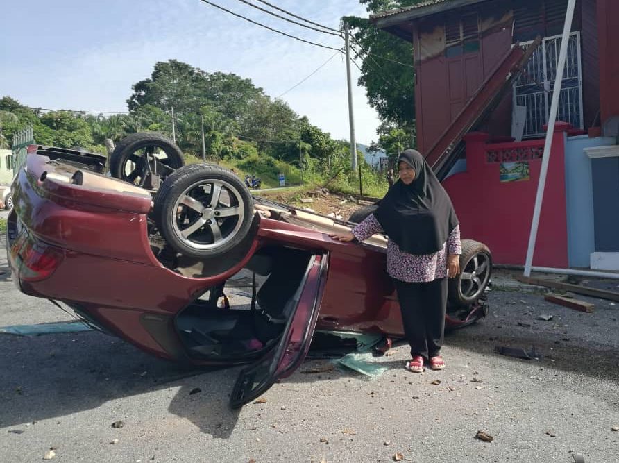 “Sebaik pintu dibuka, saya nampak sebuah kereta terbalik dan enjinnya mula berasap. Saya kemudiannya memanggil suami, Baharuddin Ariffin, 67, untuk melihat kejadian itu.