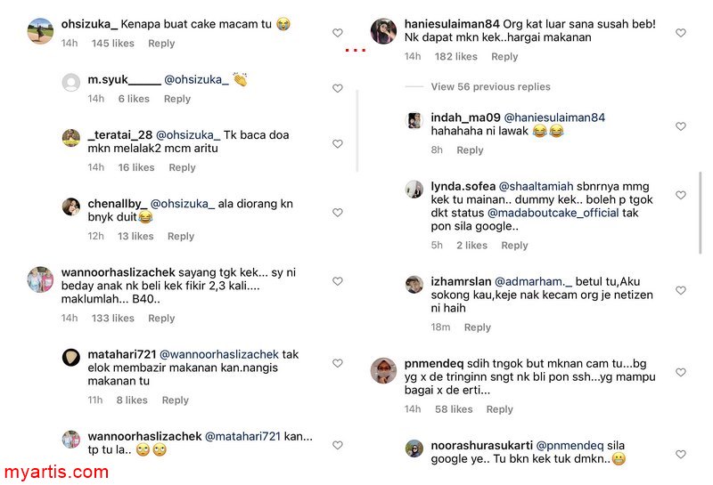 Netizen turut mempersoalkan mengapa makanan diperlakukan sebegitu sedangkan ramai mereka diluar sana yang teringin nak makan kek tetapi tidak berkemampuan. Namun, ada yang mempertahankan pelakon itu dengan mengatakan kek tersebut dibuat untuk dihancurkan, bukan untuk dimakan.