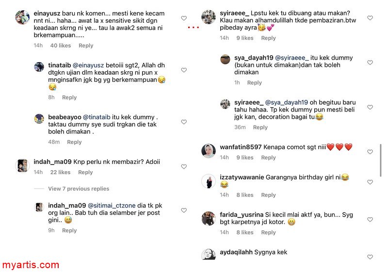 “Saya memang suka ambil gambar yang cantik-cantik untuk disimpan sebagai kenangan. Sewaktu hari jadi anak pertama, Aqeef Anaqi dulu pun, saya adalah buat sambutan sebegitu. Jadi, untuk Ayra pun saya terfikir mahu gambar yang menarik untuk dikenang. Apapun, saya ingin jelaskan bahawa tiada pembaziran pun berlaku dalam sambutan itu,” ujarnya lagi.