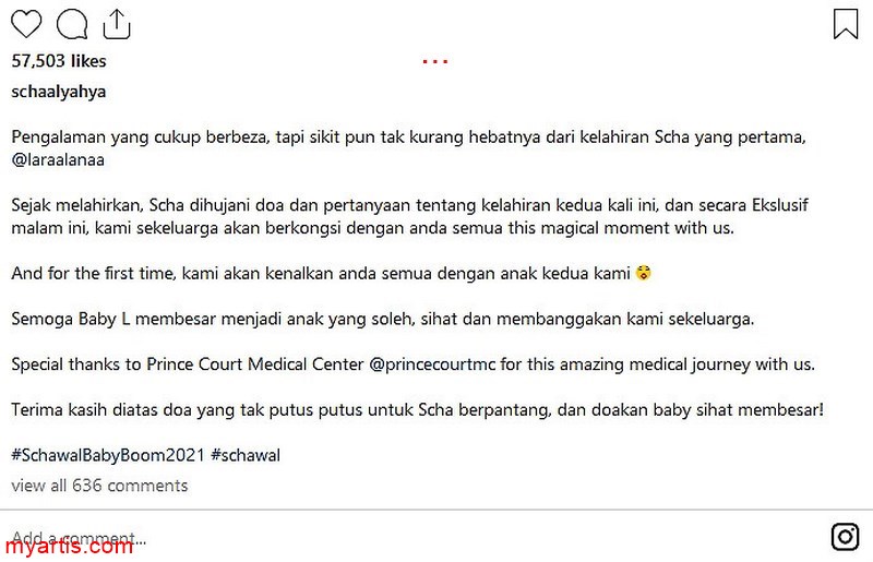 “Dalam episod istimewa semalam, penonton dapat menyaksikan saat getir proses kelahiran dan buat pertama kalinya mereka berkenalan dengan Baby L secara ekslusif. Sekarang, Scha sedang berpantang dan anak pun sedang menyesuaikan diri di rumah. Terima kasih di atas doa anda,” tuturnya.