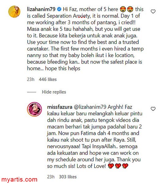 Perkongsian Fazura di Instagrammiliknya pada Ahad mendapat perhatian daripada penyanyi Liza Hanim yang turut memberi tip menguruskan anak sebelum kembali bekerja.