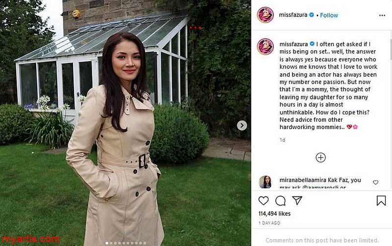 “Tetapi sekarang saya sudah bergelar ibu, rasa berat nak tinggalkan anak berjam-jam sehari. Macam mana saya nak atasi perkara ini? Perlukan nasihat daripada ibu-ibu yang rajin bekerja di luar sana,” demikianlah soal pelakon Nur Fazura di laman Instagram.
