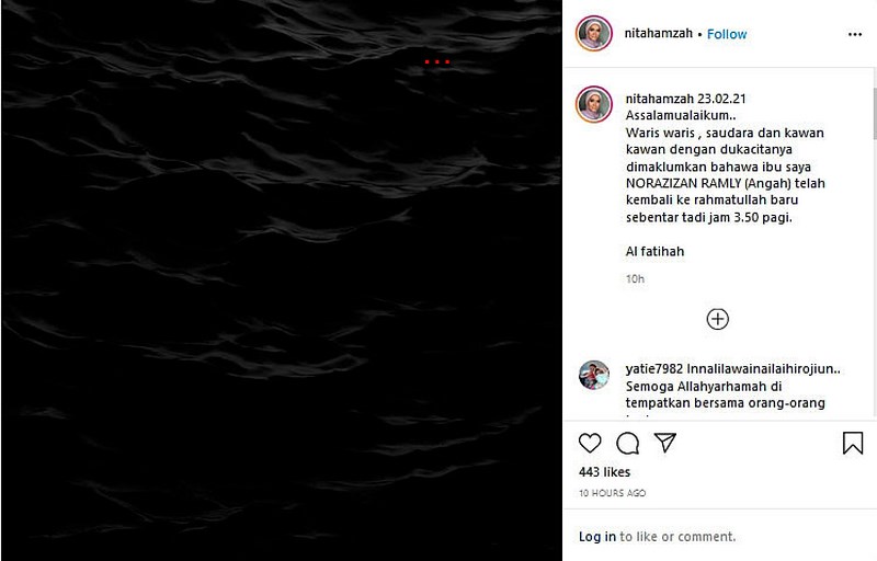 “23.02.21 Assalamualaikum. Waris waris , saudara dan kawan kawan dengan dukacitanya dimaklumkan bahawa ibu saya NORAZIZAN RAMLY (Angah) telah kembali ke rahmatullah baru sebentar tadi jam 3.50 pagi,” tulis penyanyi Nita Hamzah yang berkongsi khabar duka apabila memaklumkan ibunya, Norazizan Ramly telah pun menghembuskan nafasnya yang terakhir sekitar jam 3.50 pagi tadi.