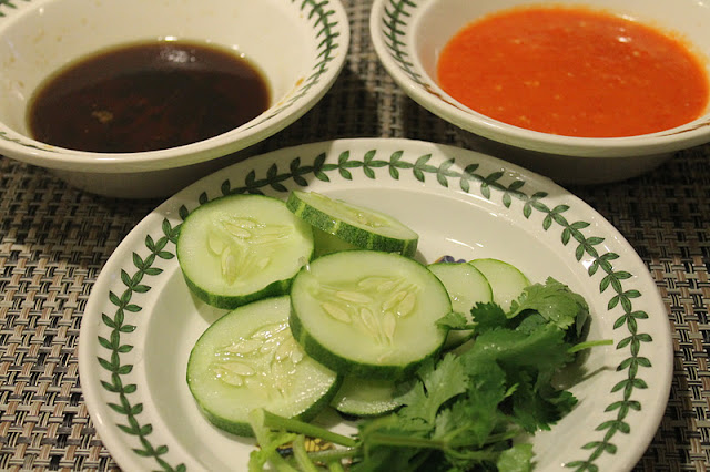 Hidangkan nasi ayam dengan sos cili, dark soy sauce, hirisan timun dan sup. Letakkan daun ketumbar atas ayam dan sedikit atas nasi.