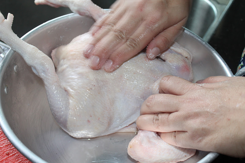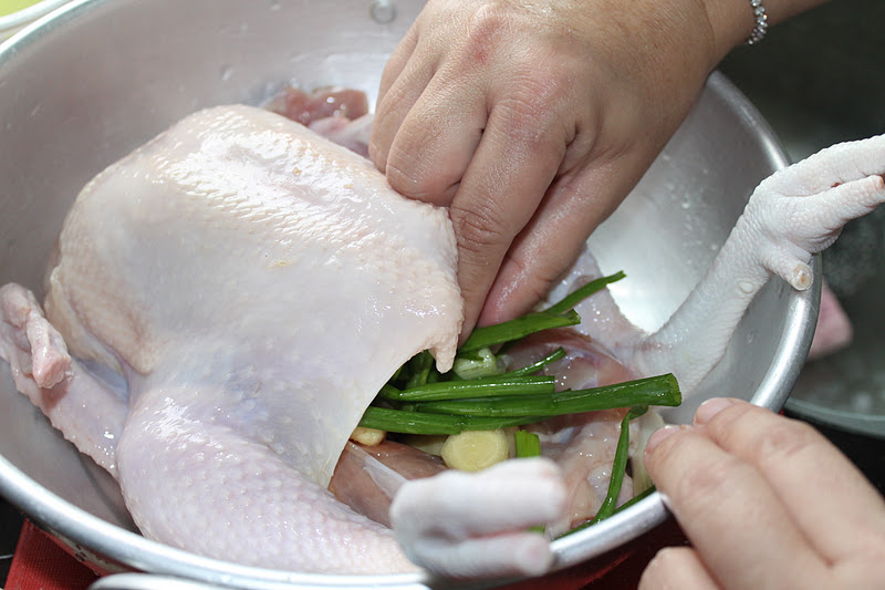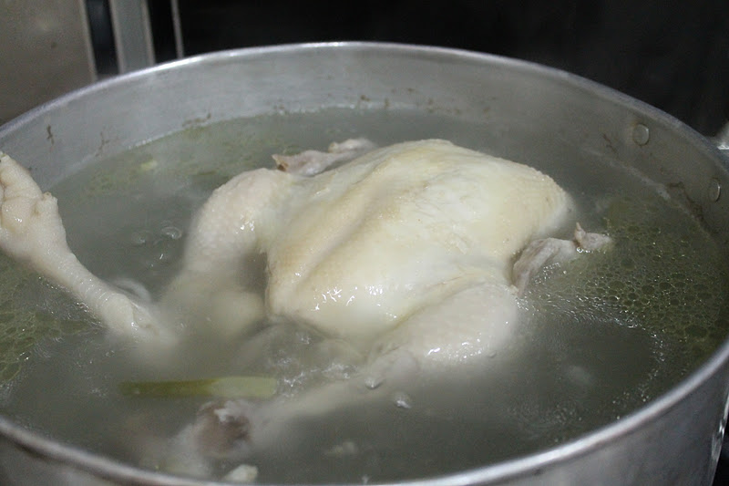 1. Bersihkan ayam dengan menggosok kulitnya dengan garam luar dan dalam bagi menghilangkan sebarang kekotoran. Bilas. Lumurkan garam luar dan dalam. Masukkan halia dan batang daun bawang ke dalam ayam. Letakkan ayam ke dalam periuk besar dan isi dengan air setinggi 1 inci menenggelamkan ayam. Panaskan dengan api yang besar sehingga menggelegak. Sebaik memggelegak, perlahankan api bagi air mendidih perlahan selama 30 minit. Cucuk dengan chopstik di bahagian paha untuk melihat samada ayam dah masak.