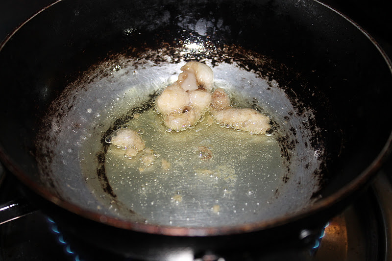 minyak dari lemak ayam diguna untuk menumis bawang putih dan halia |
