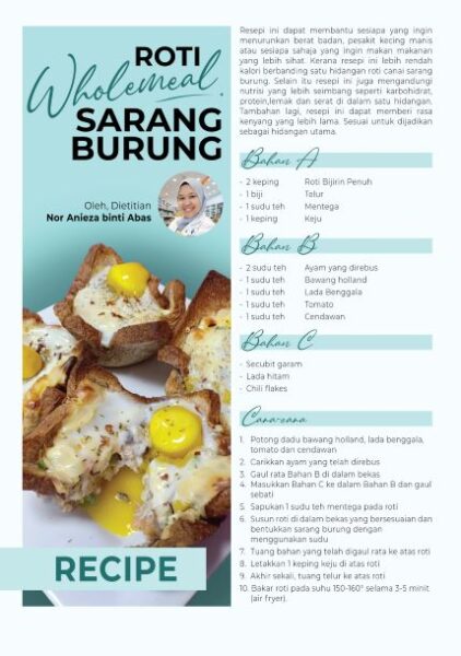 “Dengan menggantikan roti canai kepada roti mil penuh atau wholemeal ia menjadikan hidangan sarapan yang rendah kalori dan kurang lemak. Resipi ini turut mengandungi nutrisi lebih seimbang seperti karbohidrat, protein, lemak dan serat dalam satu hidangan. Ia dapat memberi rasa kenyang lebih lama. Ia sesuai dijadikan sebagai hidangan utama,” katanya.