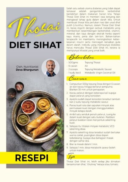 Penggemar sarapan thosai boleh mencuba resipi dari Deva Bhargunan. Pakar pemakanan ini menggantikan tepung beras dengan suplemen makanan ‘Metabolic Sauver’ yang membantu mengawal kadar gula dalam darah untuk pesakit diabetes.