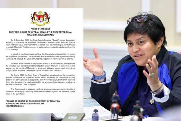 Pada Khamis media melaporkan keputusan Mahkamah Rayuan Paris membatalkan sepenuhnya ‘Award Akhir’ dalam tuntutan pihak yang mendakwa sebagai waris Kesultanan Sulu terhadap Sabah disifatkan sebagai kemenangan besar kepada negara.