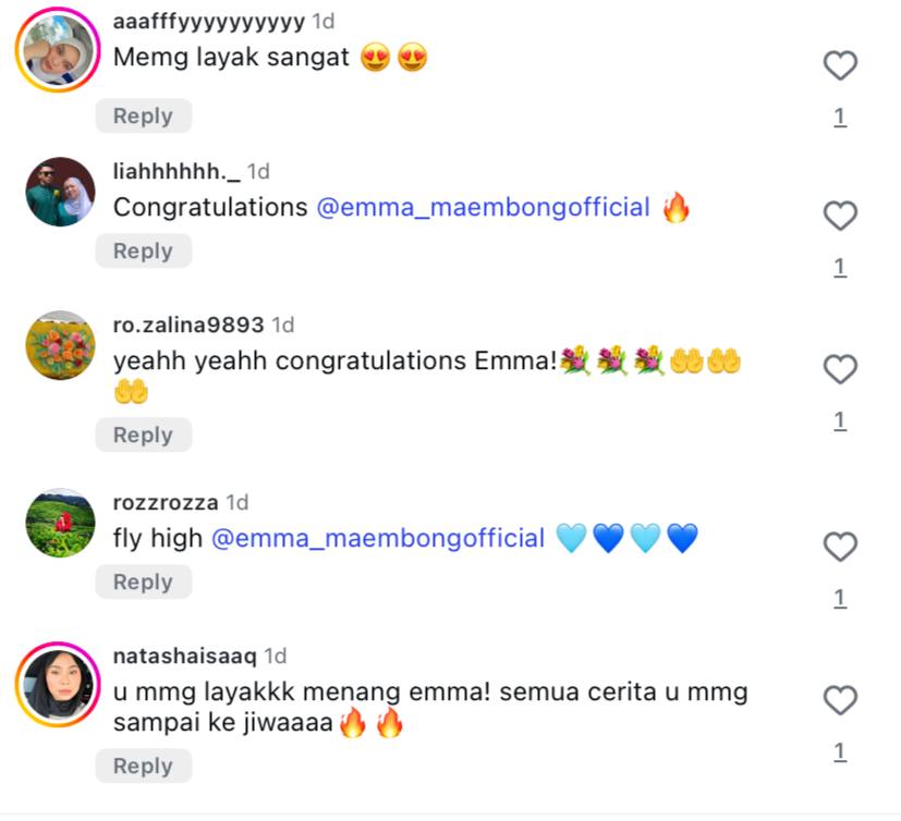 Menerusi satu hantaran di Instagram, Emma meluahkan rasa syukur dan terharu atas sokongan padu daripada para peminat yang tak pernah jemu mengundi dan sentiasa ada di belakangnya. Mengakui air mata mengalir tanpa sedar, Emma berkata kemenangan tersebut sangat bermakna buat dirinya kerana terasa seperti segala usaha, penat lelah dan kesabaran selama ini akhirnya berbaloi.