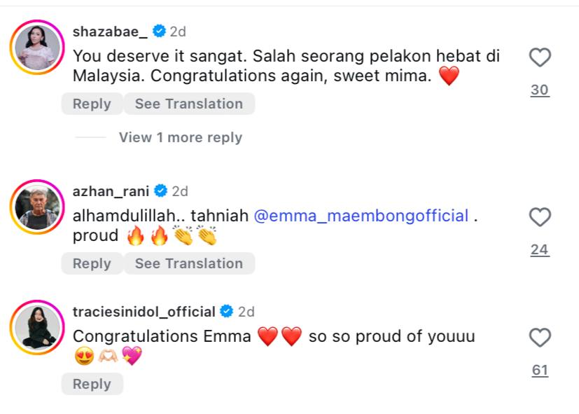 Dalam masa yang sama, Emma turut menzahirkan penghargaan kepada keluarga tercinta terutamanya ibu bapa, adik-beradik serta rakan-rakan rapat yang sentiasa beri sokongan tanpa henti. Katanya, doa daripada keluarga menjadi sumber kekuatan utama untuk dia terus bertahan dan beri yang terbaik dalam setiap watak yang dibawakan.