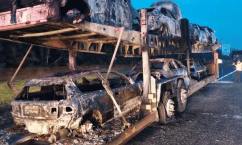 KULAI: Sebuah treler bersama muatan tujuh kereta ubah suai pelbagai jenis terbakar di Kilometer 38.1 Lebuhraya Utara-Selatan (PLUS) arah utara…
