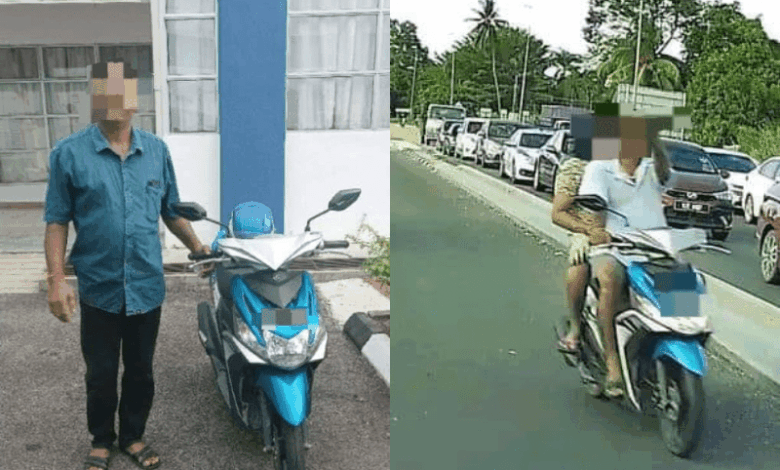 Tindakan seorang lelaki yang tular tidak bertopi keledar dan melawan arus di persimpangan lampu isyarat sekitar Sungai Manggis di sini,…