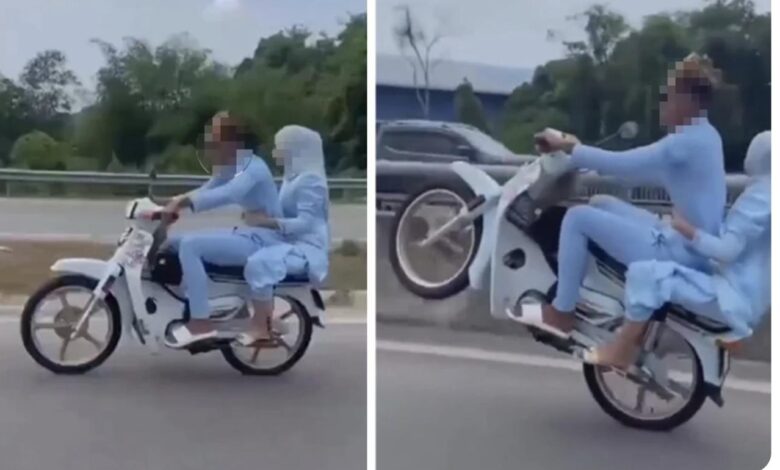 Suami isteri buat aksi ‘wheelie’ akhirnya ditahan polis
